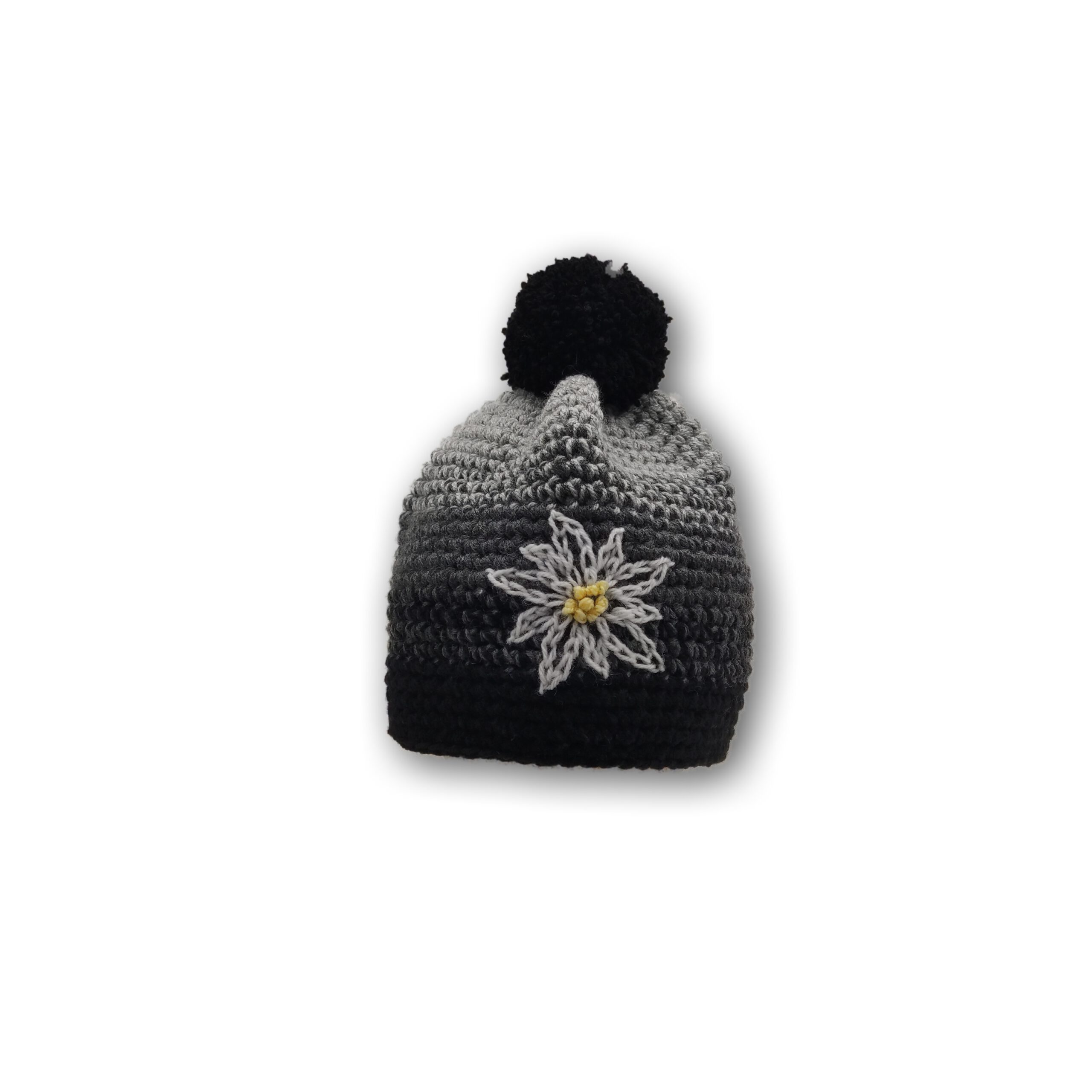 Jede Mütze ist handgehäkelt und bestickt und daher ein Unikat.