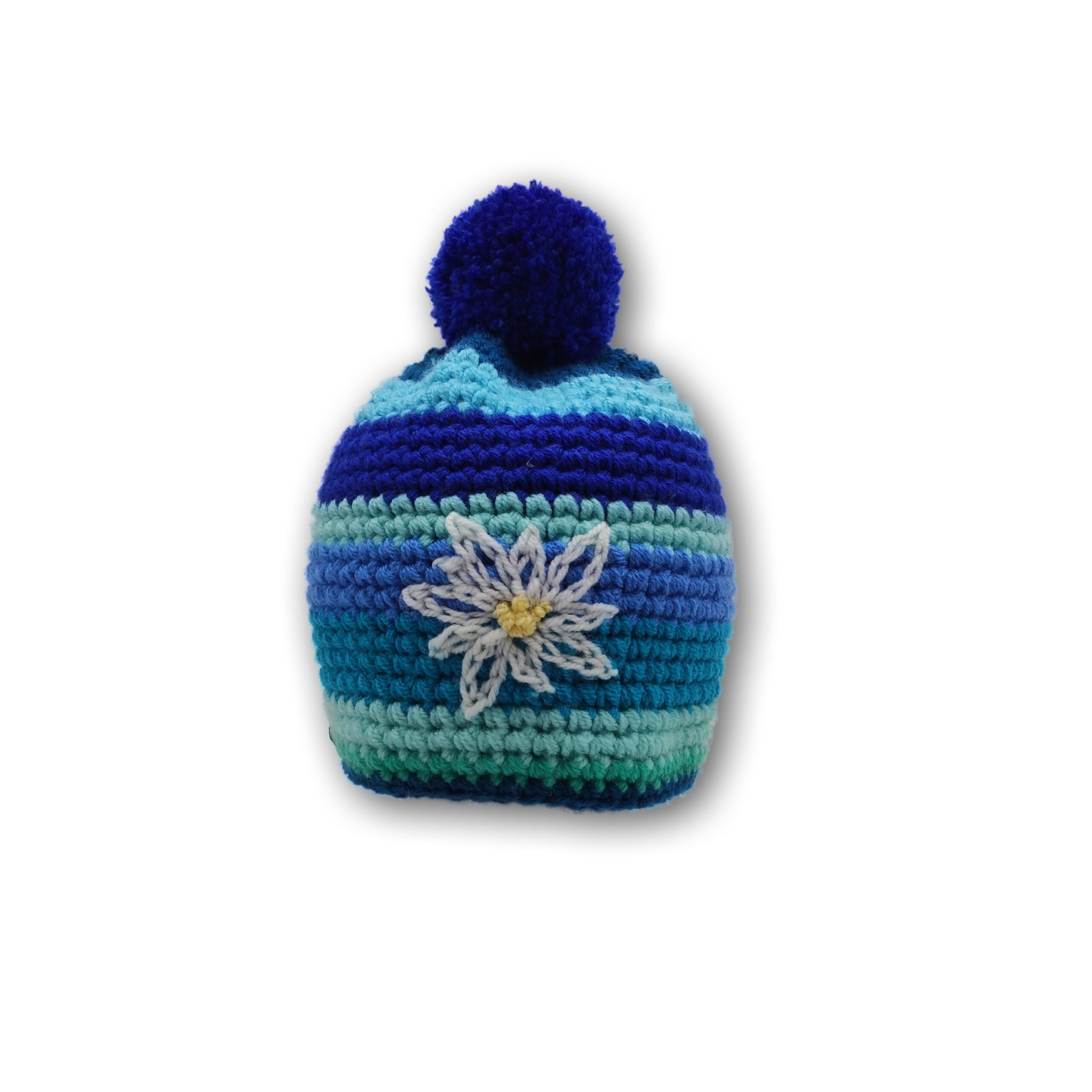 Jede Mütze ist handgehäkelt und bestickt und daher ein Unikat.